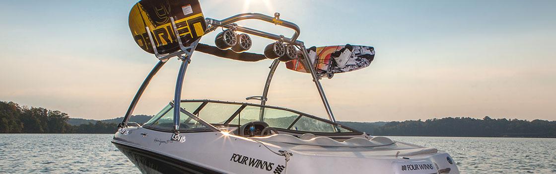If you’re upgrading your boat on Lake Cumberland, two of the most popular additions are a bimini top or a wakeboard (Monster) tower.